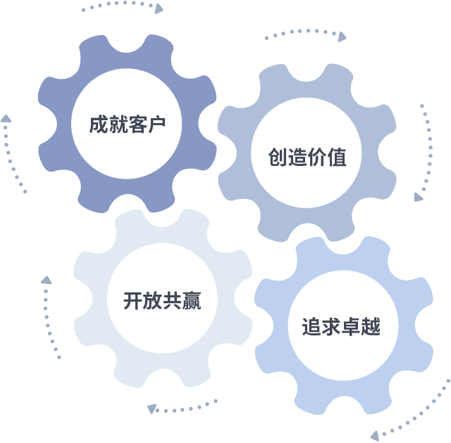 成就客户是一切决策的出发点,,,创造价值是衡量所有工作的标准,,,追求卓越是我们做事做人的态度,,开放共赢是我们的格局也是最终的结果。。。价值观的齿轮环环相扣,,推动着组织里的每个人不断向前。。