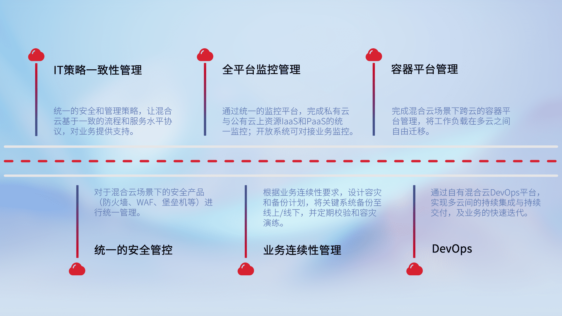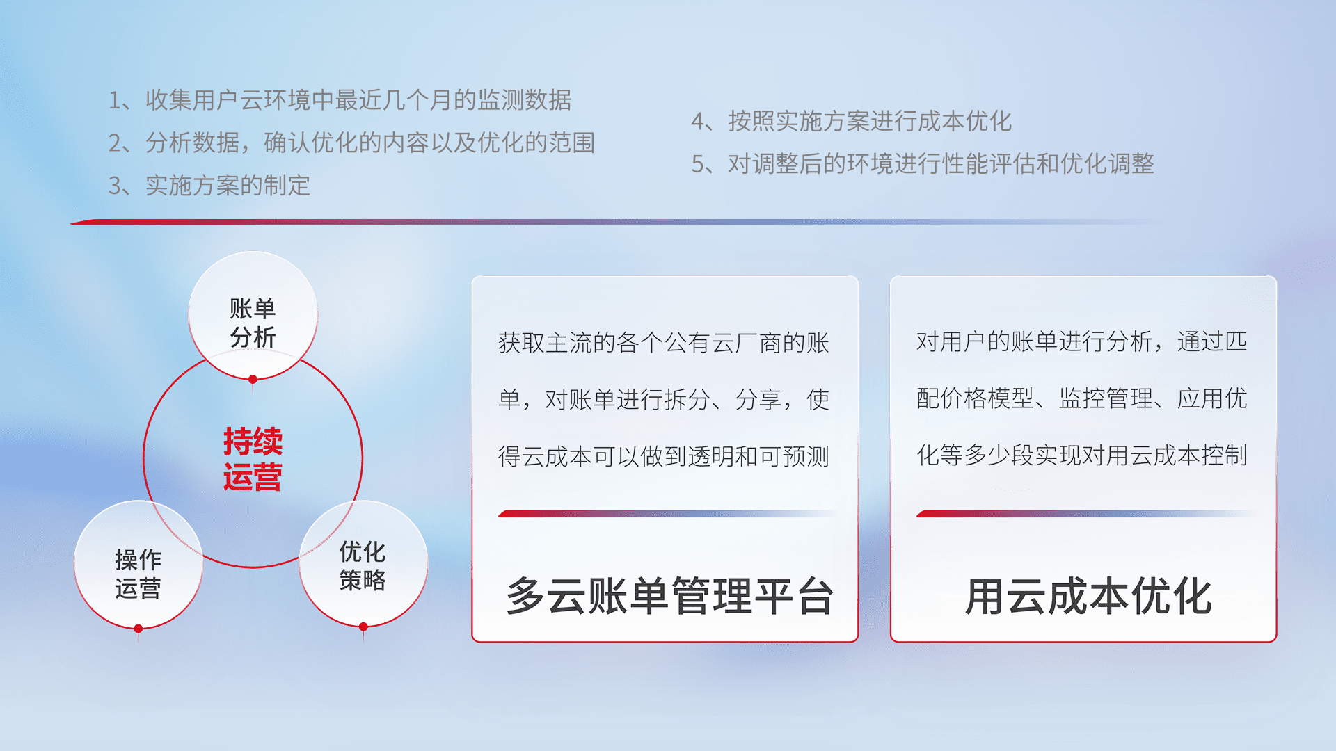 通过多云纳管,,,以统一的资源数据模型把客户的云资源进行抽象和封装,,进而实现对多云资源的统一操作,,保障云资源管理的可靠性、、、、稳定性与可用性。。量身定制化运维内容,,,配置、、、开发运维、、、补丁管理、、、、备份、、、、监控、、认证和访问管理、、审计和日常巡检等,,保障在用云过程中的可靠度,,稳定度以及高可用率。。